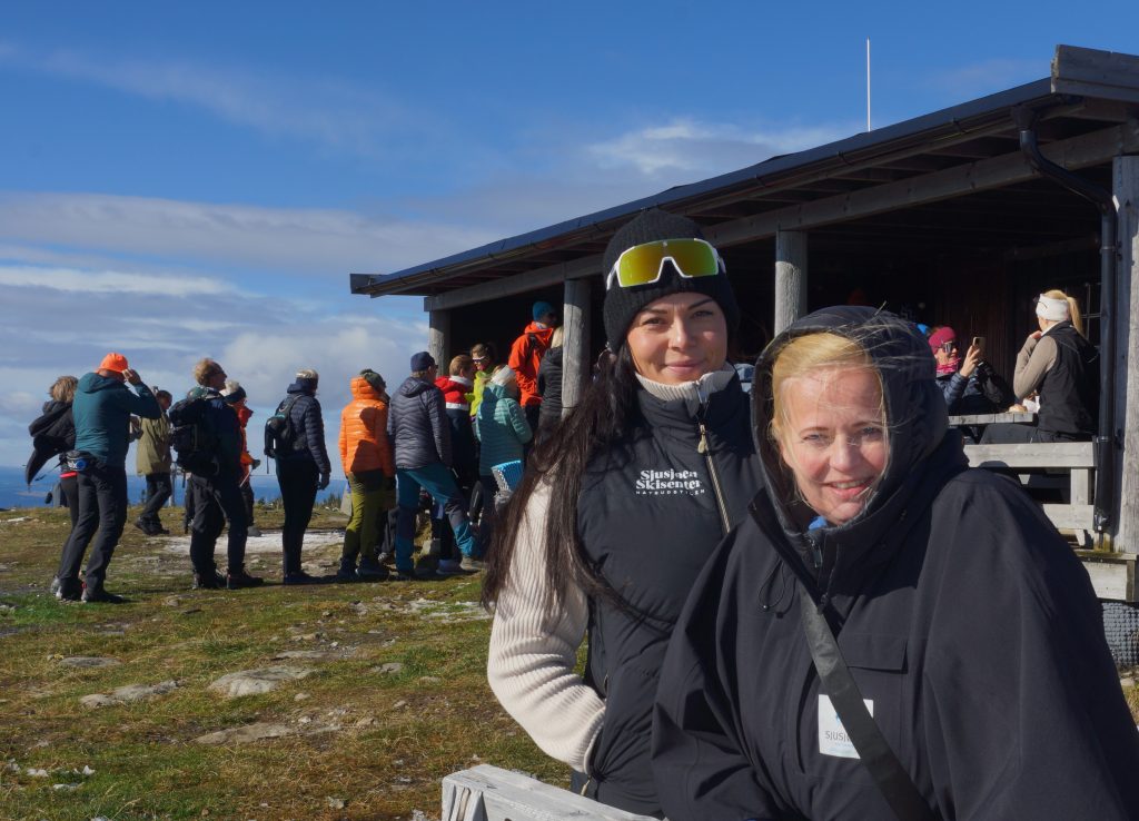 Tone Alterskjær fra Visit Sjusjøen (foran) og Heidi Fauskrud Brukstuen, daglig leder i Sjusjøen Skisenter foran Brannhytta og mange fornøyde gjester på gjenåpningsdagen.