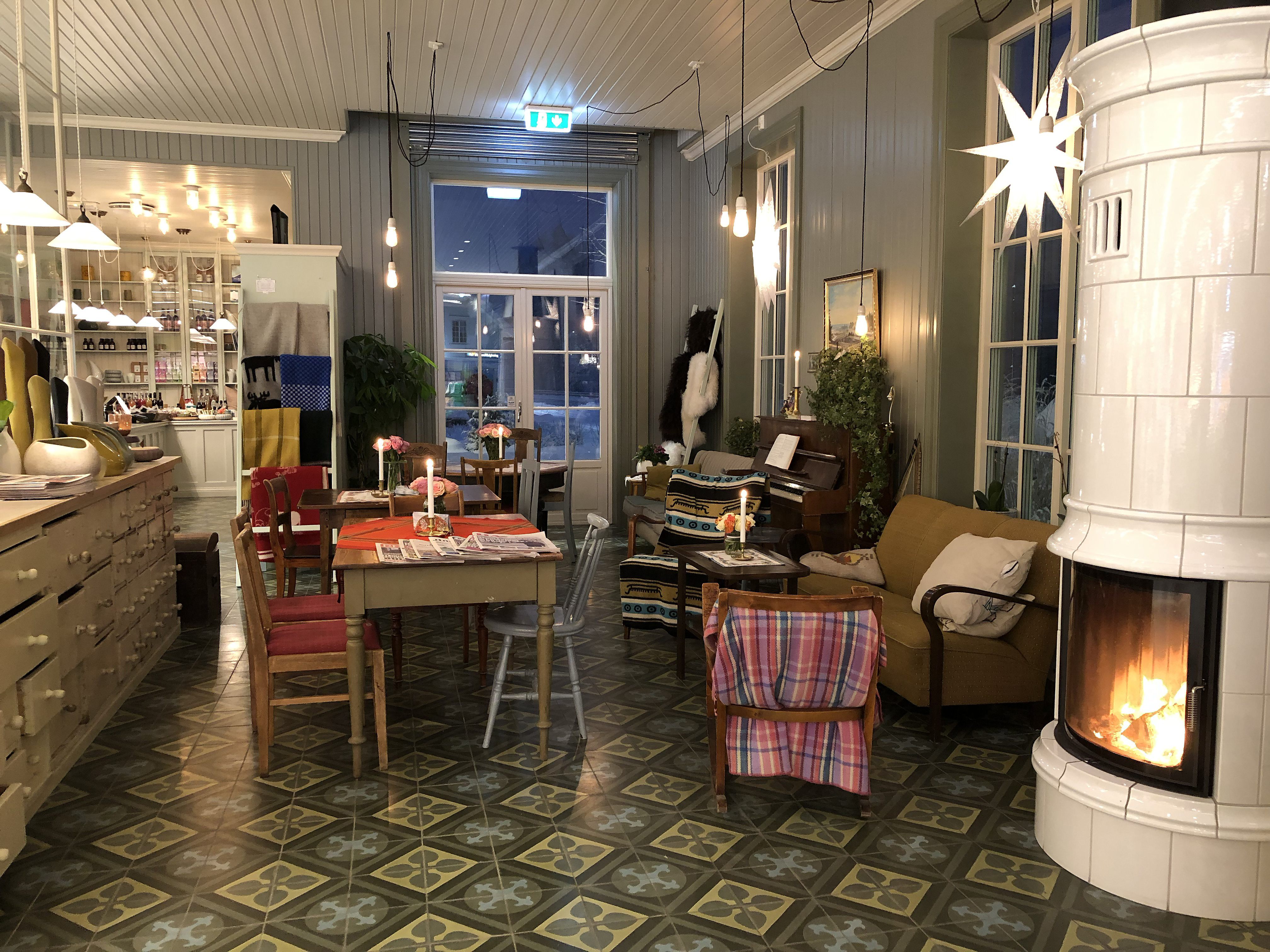 Samtidig har de tatt vare på tradisjonen med butikken som et sted hvor folk møtes. Utenfor kassaapparatene er det et område hvor piano, peis og sitteplasser skaper god atmosfære og en innbydende møteplass for kundene.
