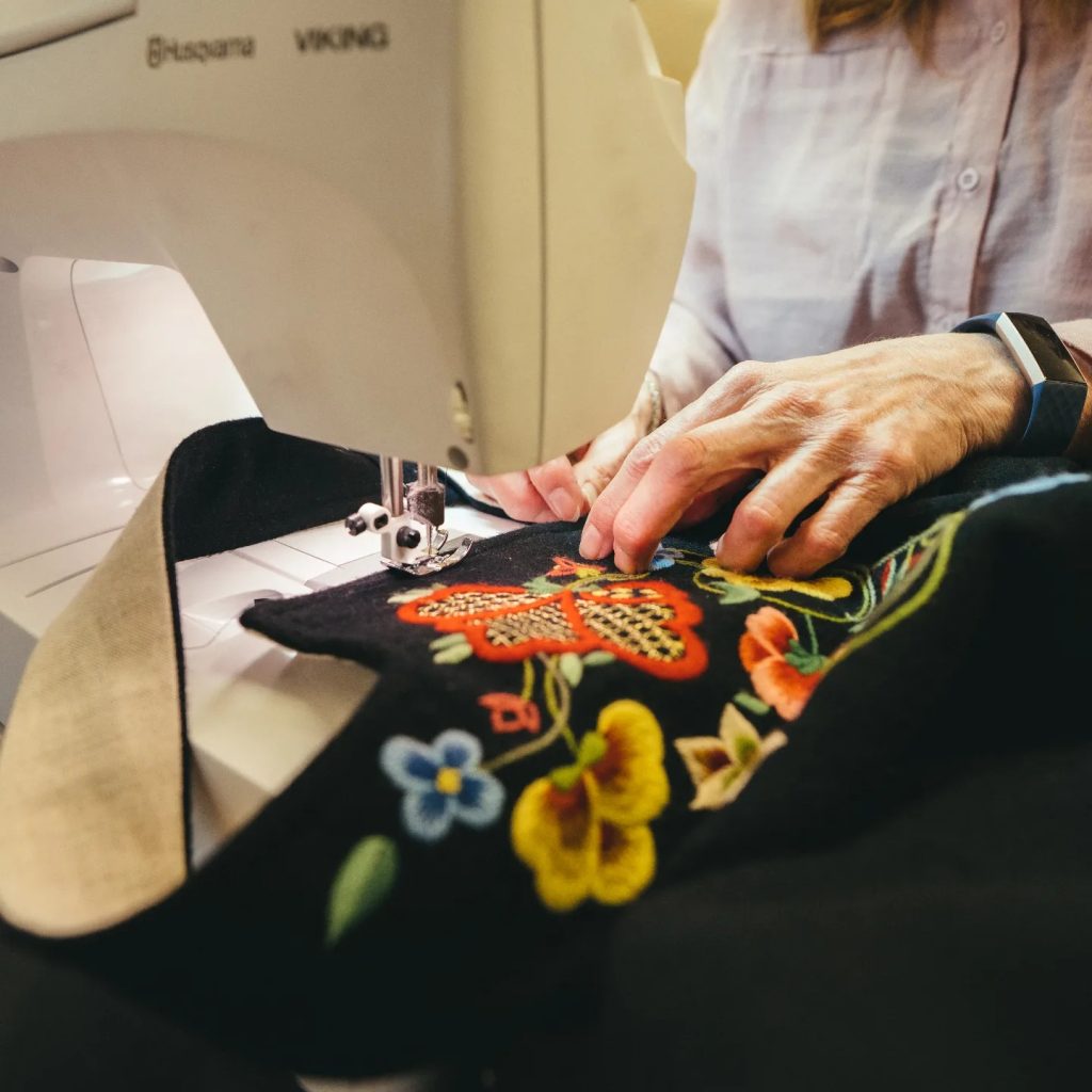 - Vi har en egen systue i 2. etasje. Her syr vi bunader fra vårt distrikt, men vi kan også sy om og reparere andre bunader. Bunaders som går i arv passer jo ikke nødvendigvis perfekt til ny eier. Dessuten hender det at bunadene «krymper» litt i skapet, forteller Evy Sunde, daglig leder på Husfliden Lillehammer.